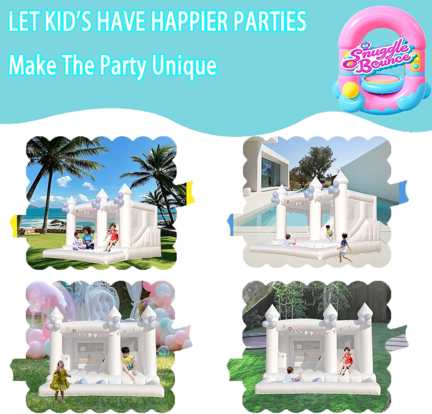 • 【 Structural Material 】Our product is made of thickened Oxford fabric that has undergone rigorous testing and certification. The double needle four thread sewing process makes the product more durable. The mesh walls on all sides are not easy to tear, making it safe for children to play in the bouncing house. Unlike the colorful traditional inflatable houses, our white inflatable house offers a more elegant and high-end appearance that is sure to catch the attention of anyone passing by. Whether used as decoration for festivals or party supplies, it is the most outstanding presence.