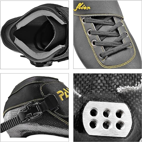 Carbon Fiber Shell: Reinforced laces and buckles, micro-adjustable ratchet buckle. Speed skate shoes, these skates are designed for speed. The shell is made of carbon fiber and is lightweight,