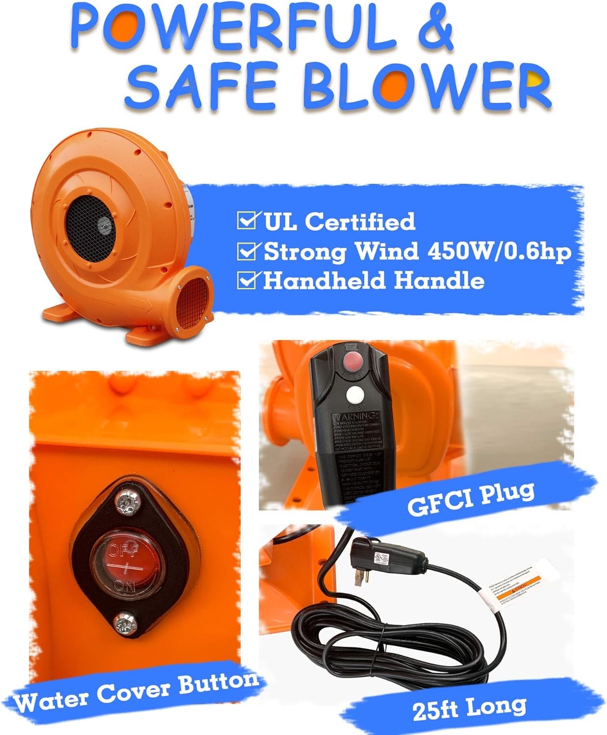 • Air Blower Included: Our bounce house includes heavy duty air blower. Water cover button and GFCI plug keep you and your kids safe while having fun. Air blower also comes with 25ft long power cord and handheld handle. Powerful and safe blower for bounce house with more fun.