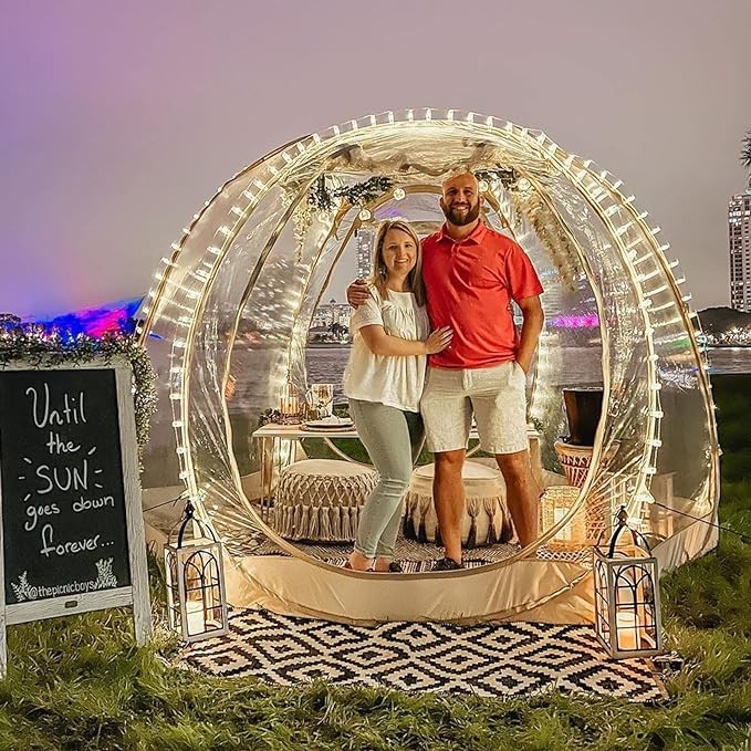 Spacious and warm: The Alvantor Big Bubble Gazebo offers room for 4-6 adults in a spacious interior shelter suitable for outdoor furniture. 6 ultra-transparent PVC screens allow for clear, 360° views. Excellent warmth retention and windproof properties. PVC screens provide a warm and relaxing outdoor space for you and your family. Note: This bubble tent will leak when wet. It has a waterproof accessory top cover, which can be purchased separately.