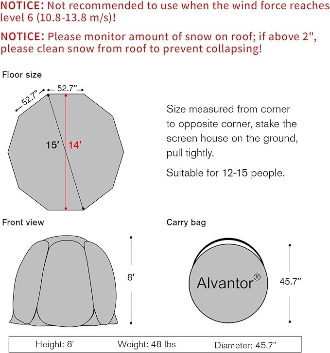 Features: This winter screen house measures 10 feet x 10 feet x 7 feet high, weighs 18.7 pounds, comes in a compact carrying case, and is 38.9 inches in diameter. Automatic pop-up, no assembly required, stable and durable. Resume normal activities while practicing social distancing. Great for creating a boundary between you and others for both personal and business use, such as restaurants, salons, etc. Since cold temperatures and snow accumulation are difficult to predict, it is not recommended to use and leave your bubble tent outside during icy and snowy weather.