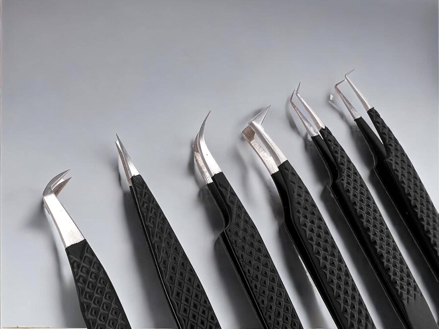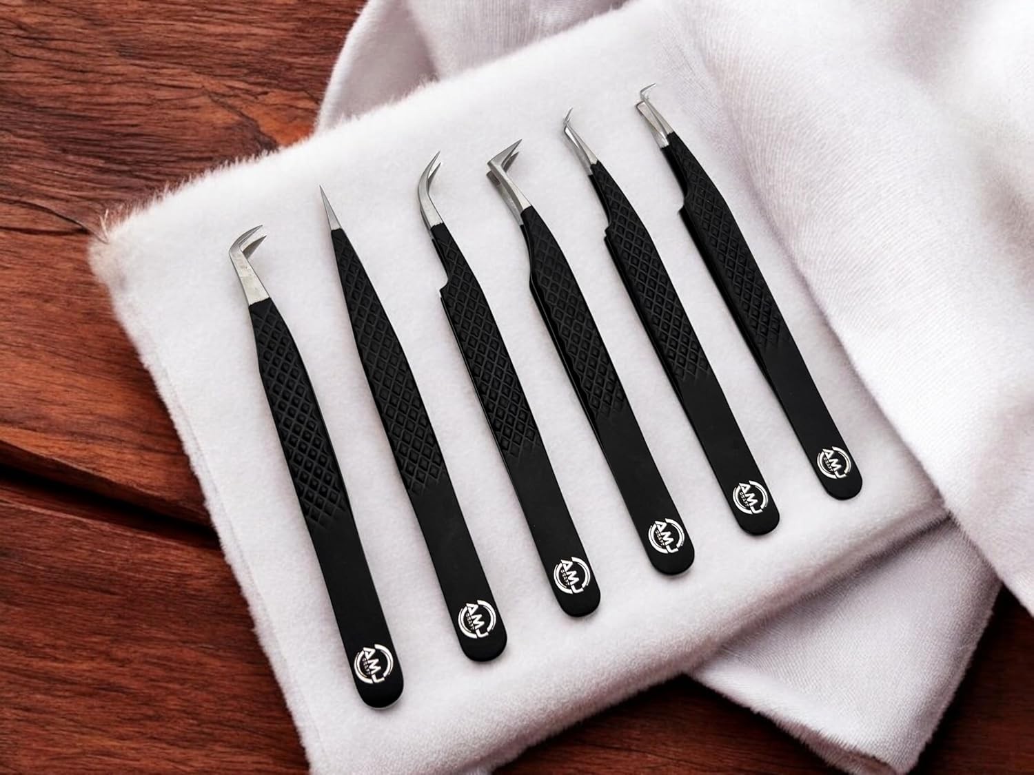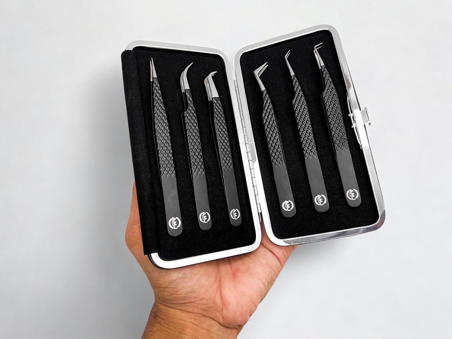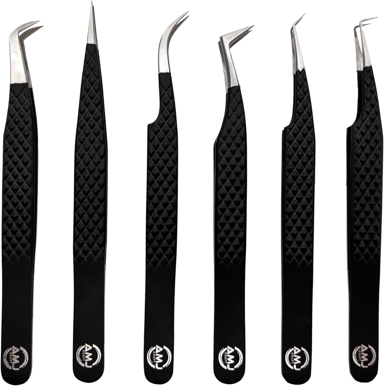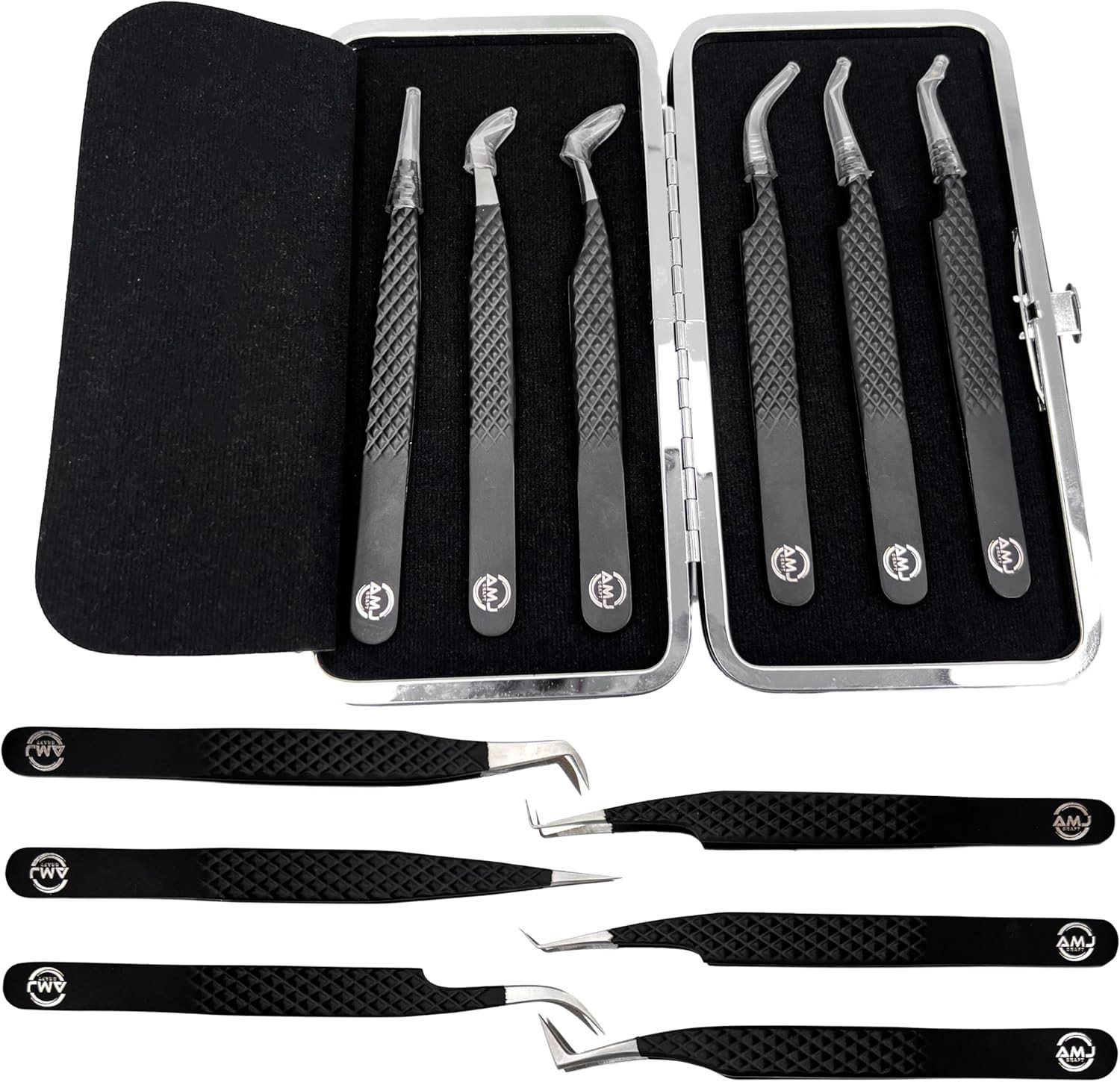 AMJ Professional Eyebrow/EYELASHES Tweezers Set, Black Stainless Steel, 6 Piece Precision/FIBER Tips with Case, women beauty care set, Best Gift for Beautiful eyes.