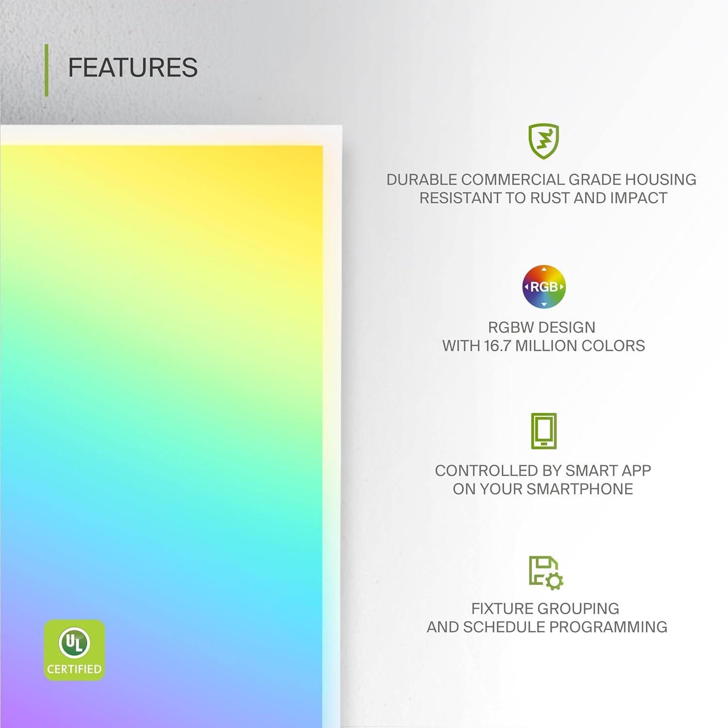 • MODERN DESIGN: SMART RGBW LED BACK-LIT FLAT PANEL comes with an anti-glare PC lens, durable commercial grade housing of anti-corrosion aluminum resistant to rust and impact, and seamless rigid frame. It has a 0-10V dimmable driver with circuit overload, short circuit, and low-voltage protection, making it both safe and reliable.