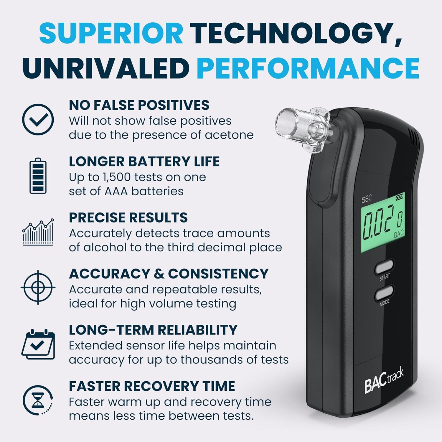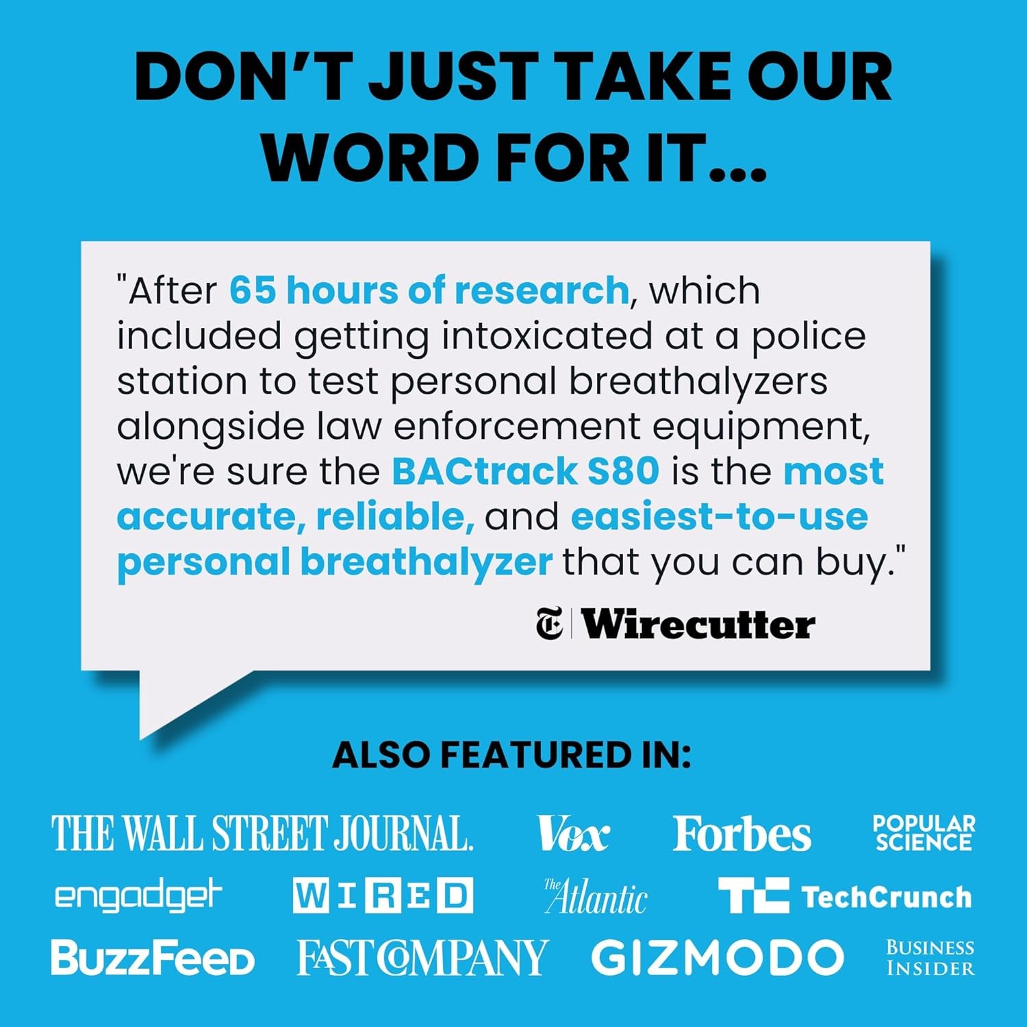 • 1 RATED BREATHALYZER BY WIRECUTTER - "After 65 hours of research, which included getting intoxicated at a police station to test personal breathalyzers alongside law enforcement equipment, we're sure the BACtrack S80 is the most accurate, reliable, and easiest-to-use personal breathalyzer that you can buy." - TheWirecutter, February 2022