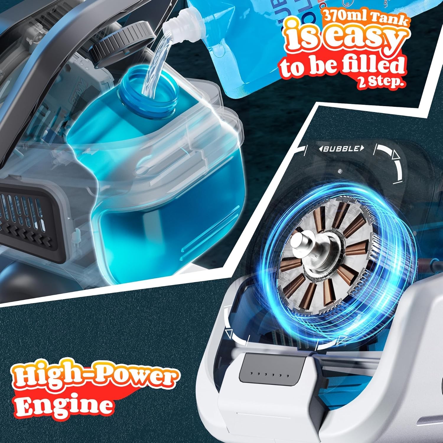 【Package Includes】This bubble machine is ready for non-stop fun! The package includes: 1 x bubble machine, 1 x remote control, 1 x Type-C charging cable, and 1 x user manual for quick and easy setup. It’s equipped with a high-powered motor that produces over 20,000 bubbles per minute, along with a 370ml bubble tank to keep the fun going without frequently refills. Be sure to keep the accessories clean for long-lasting use.