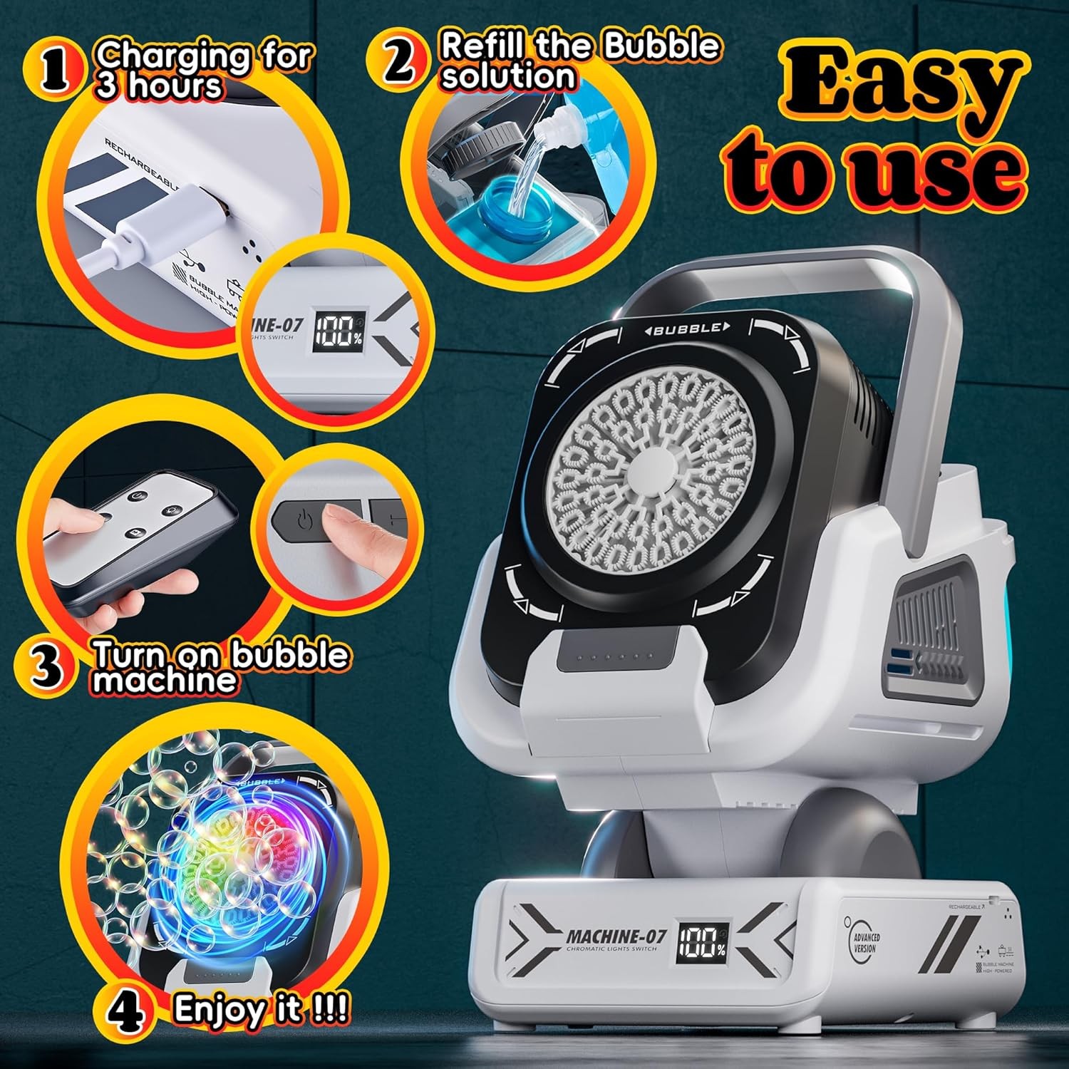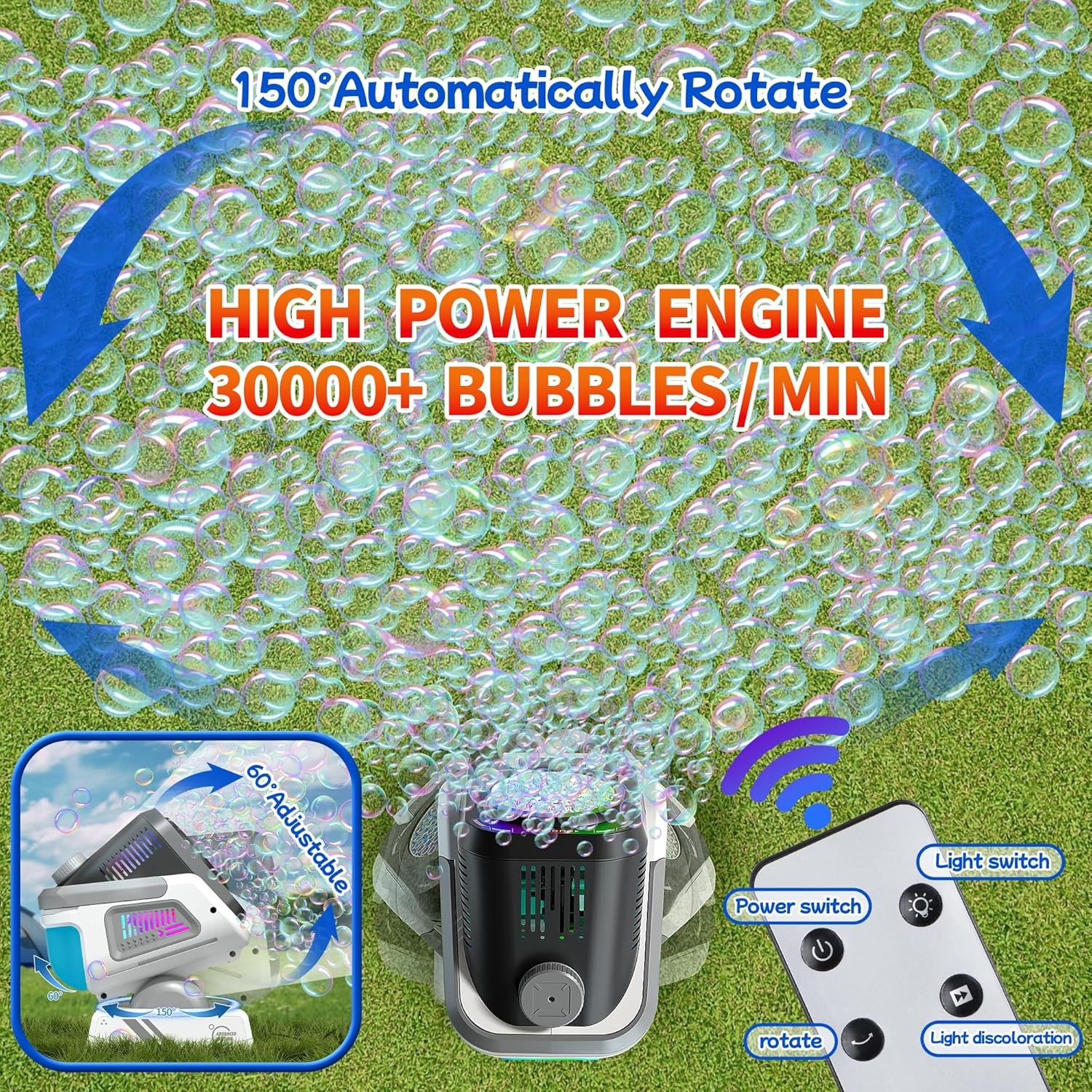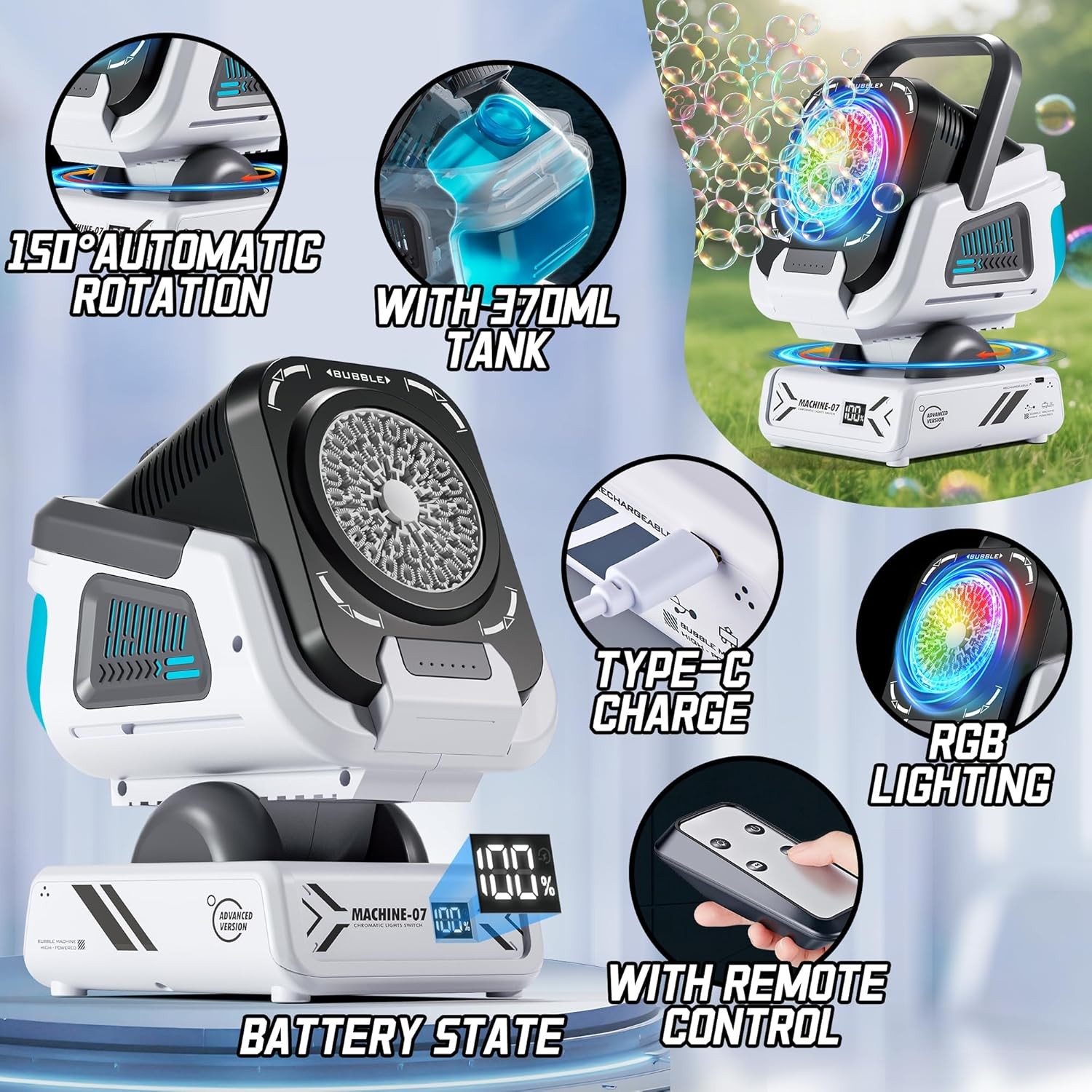 【Function】This bubble machine comes equipped with an 1800 mAh Battery Type-C, delivering up to 90 minutes of nonstop fun. It features 150°automatic rotation, 60°adjustable tilt, and 7 color RGB lights. Lightweight and easy to carry, it supports remote control and is perfect for both indoor and outdoor play.