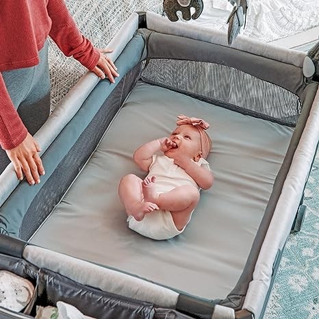 Removable Infant Bassin – Elevated, easy-access newborn bassinet for babies up to 15 lbs. Featuring a zippered, machine washable mattress pad cover for easy cleanup, and soft mesh siding on the play bed for ventilation and visibility.
