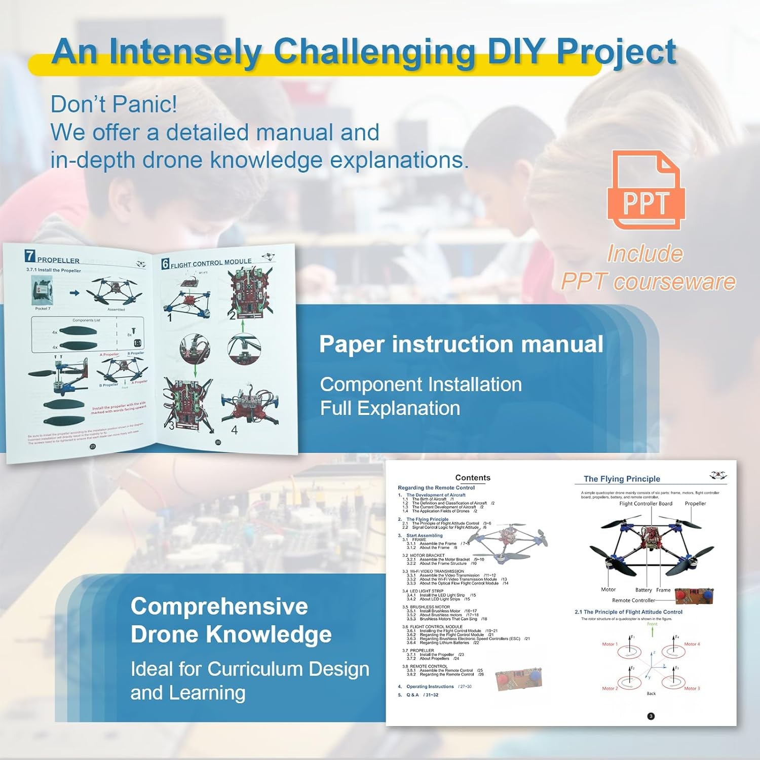 • 2. A Project Worth Showcasing:Packed with extensive foundational knowledge about drones, this kit allows you to deeply understand drone technology during assembly. Master the principles and confidently showcase your expertise, gaining admiration from friends.