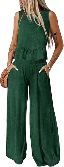 Dokotoo Pants Sets Women 2 Piece Outfits Sleeveless Round Neck Tank Tops Matching Sets for Women Elastic Waist Wide Leg