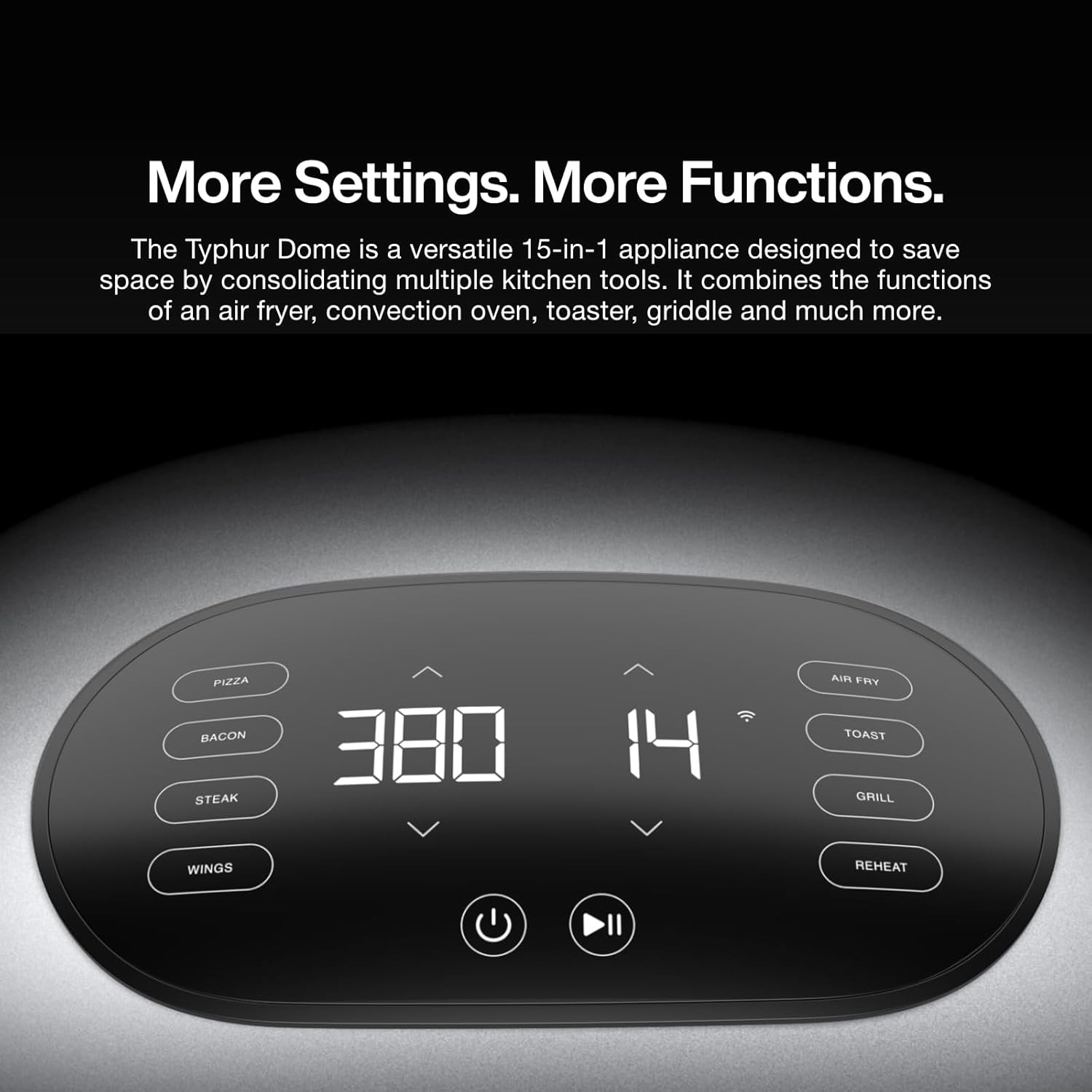 The Typhur Dome 2 is designed to save space by consolidating multiple kitchen tools in to one. It’s capable of 15 cooking functions, including Pizza, Bacon, Steak, Wings, Fries, Frozen, Air Fry, Toast, Grill, Bake, Griddle, Roast, Broil, Dehydrate, and Reheat, covering nearly every cooking need.