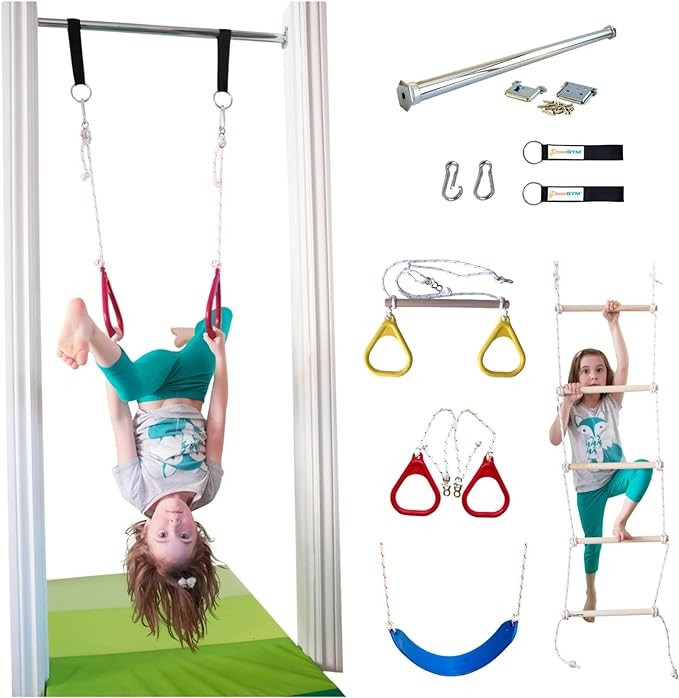 The kit includes: Door Knob, Rope Ladder, Belt Swing, Gym Ring and Ladder Bar and Ring Combo.