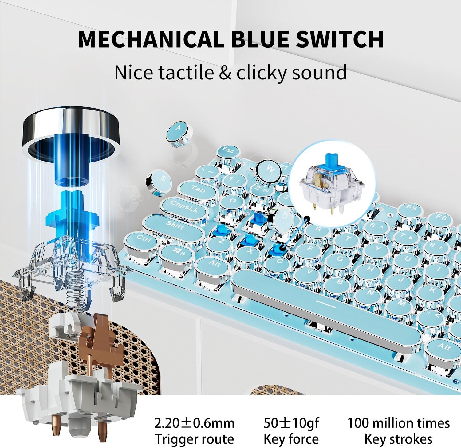 • Upgraded Gray Gradient Keycaps: TK950 wireless typewriter keyboard adopts gray gradient, two-color injection-molded retro punk round keycaps, clear backlight, and extremely durable. Stepped floating keycaps that fit your fingertips perfectly, precise position. Ergonomic foot support makes typing less tiring and more comfortable. Highly-durable mechanical blue switch responds faster and more quickly, accompanied by crisp click
