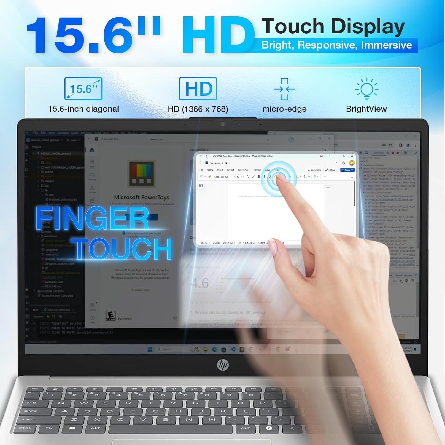 • ➤【MODERN DESIGN & CONNECTIVITY】15.6" HD touchscreen with 85% screen-to-body ratio and anti-glare finish delivers clear, vibrant visuals for school, streaming, and video calls. Features a sleek silver design with full-size keyboard and numeric pad. Equipped with Wi-Fi 6, Bluetooth 5.3, HD camera, stereo speakers, USB-C (data only), USB-A, HDMI, and more for everyday multitasking.