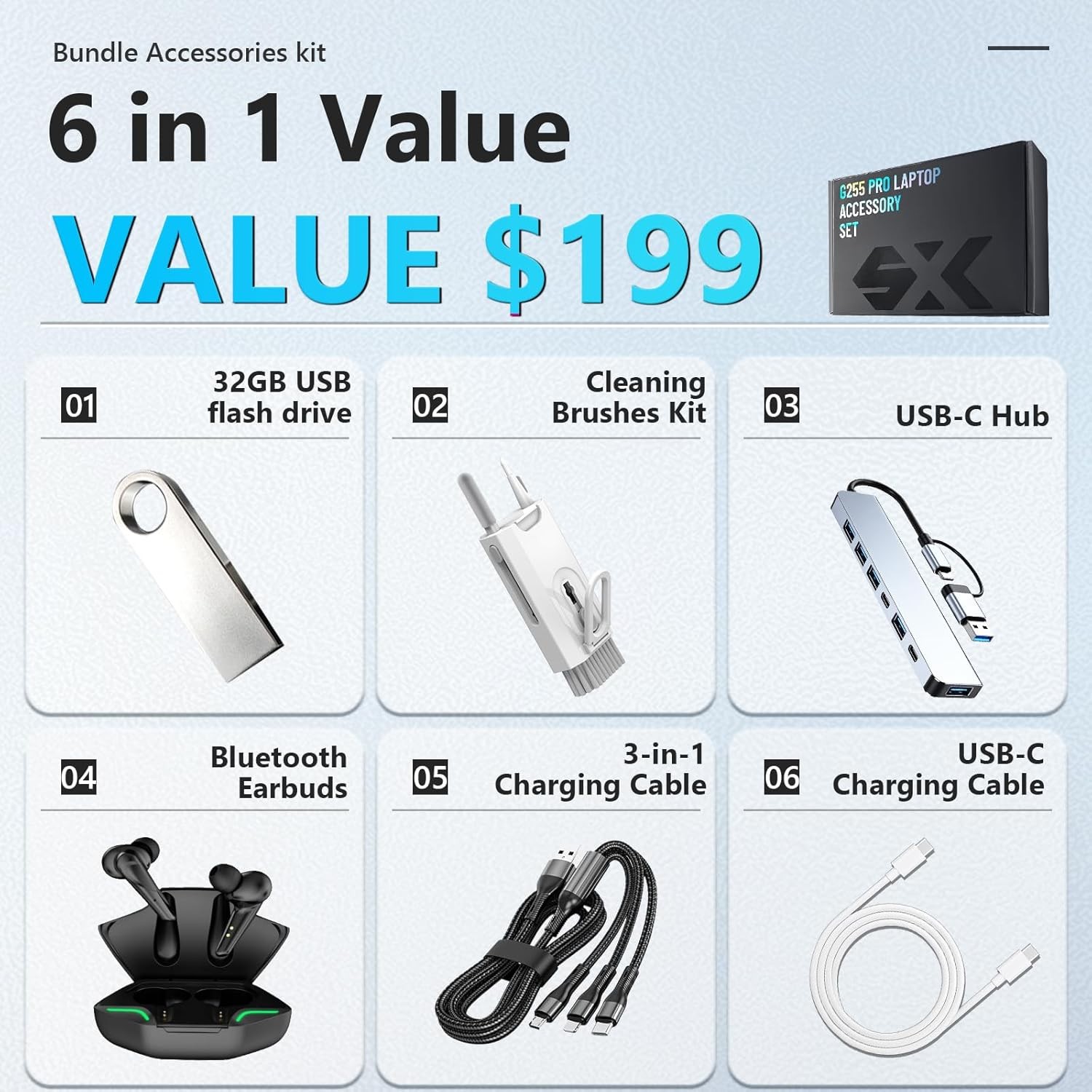 • ➤【ESSENTIAL BUNDLE】Includes a 6-in-1 SXK accessory kit (Patented): 32GB USB Flash Drive, Bluetooth Earbuds, Electronic Cleaning Kit, USB-C Hub, 3-in-1 Charging Cable & USB-C Cable. Comes with Windows 11 Pro—an ideal setup for students needing instant productivity for school and everyday tasks.
