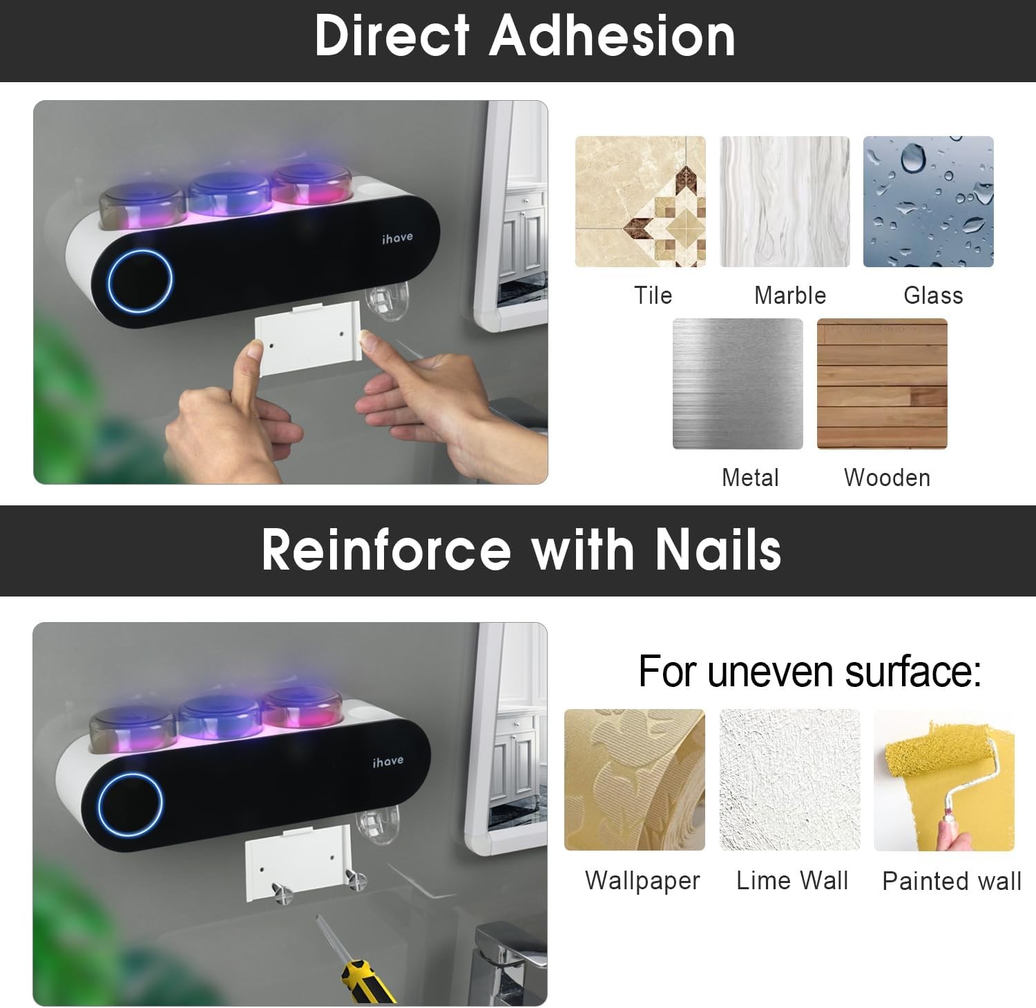 iHave Toothbrush Holders for Bathrooms, UV Toothbrush Sanitizer and Holder Smart Home Bathroom Accessories, 3 Cups Electric Toothbrush Holder Wall Mounted with Toothpaste Dispenser Bathroom Decor