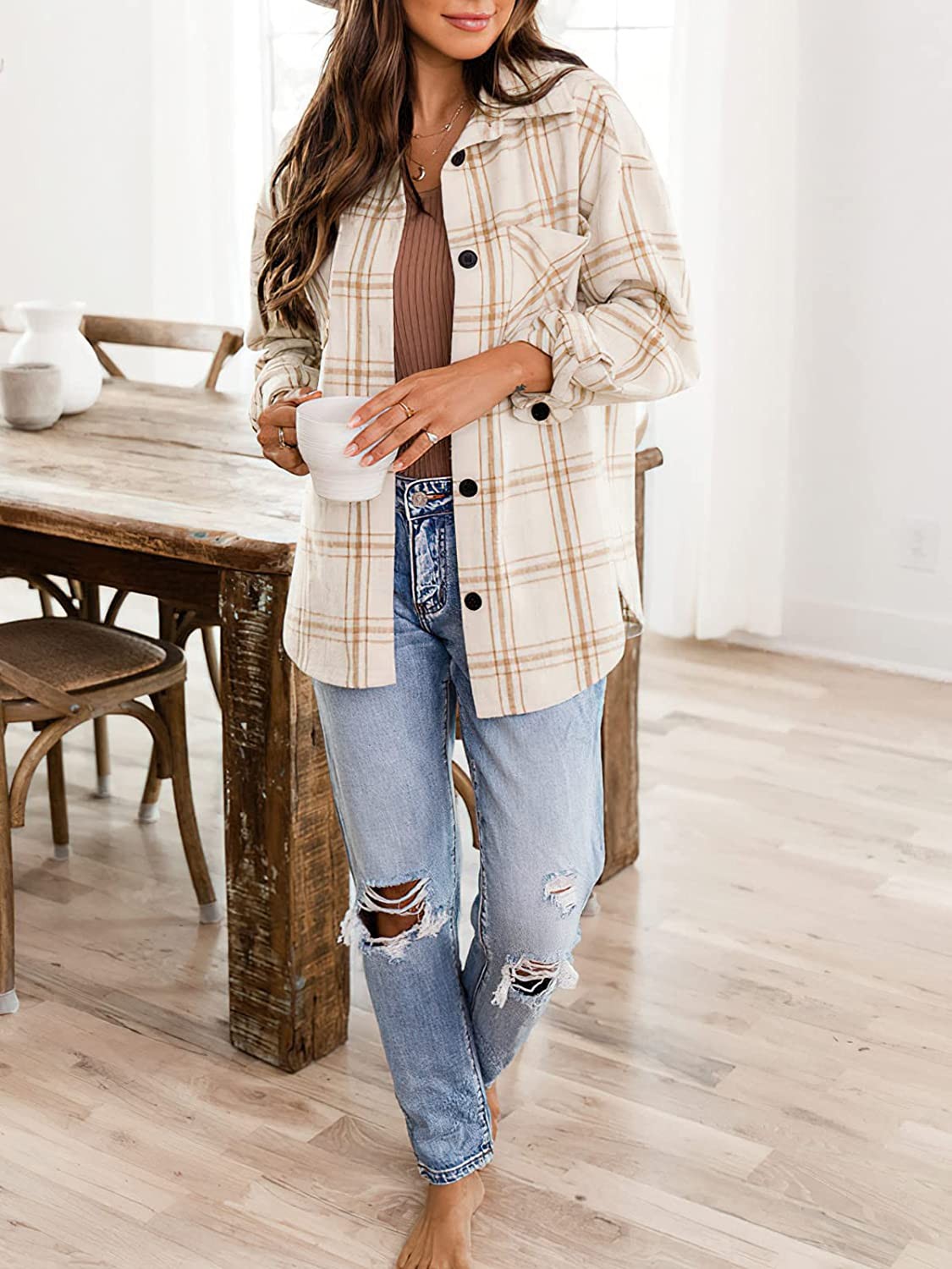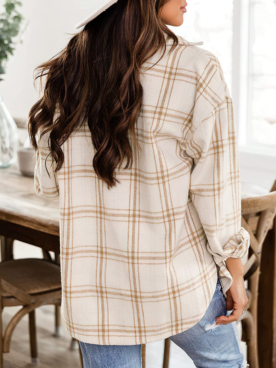 LOGENE Womens Casual Plaid Shirts Color Block Long Sleeve Lapel Button Jacket Coats with Pockets