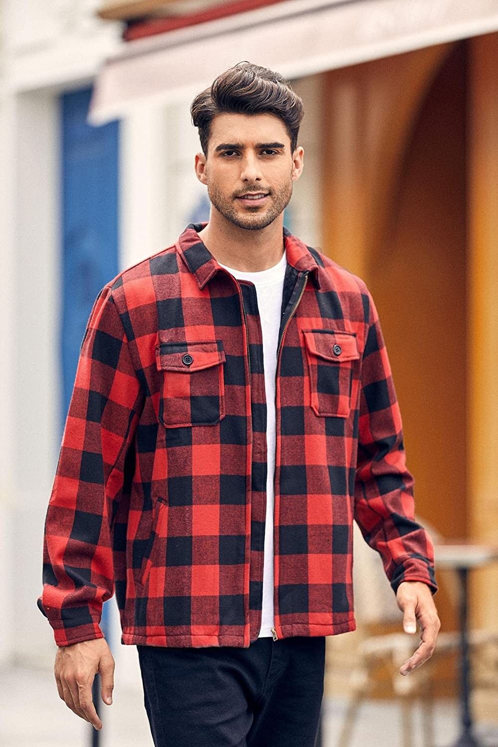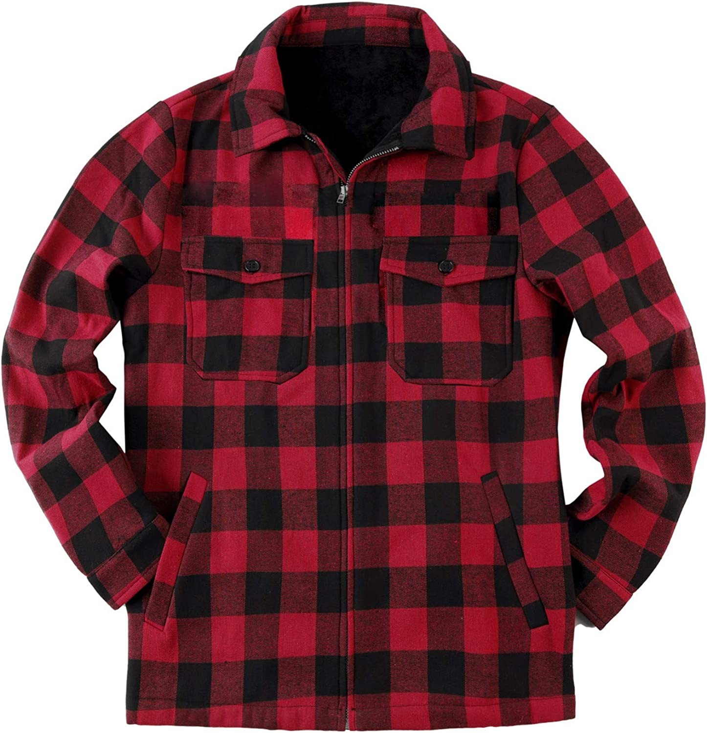 Mens Fleece Jacket Sherpa Lined Zip Up Buffalo Plaid Flannel Coat Casual Long Sleeve Warm Fall Winter Outwear @