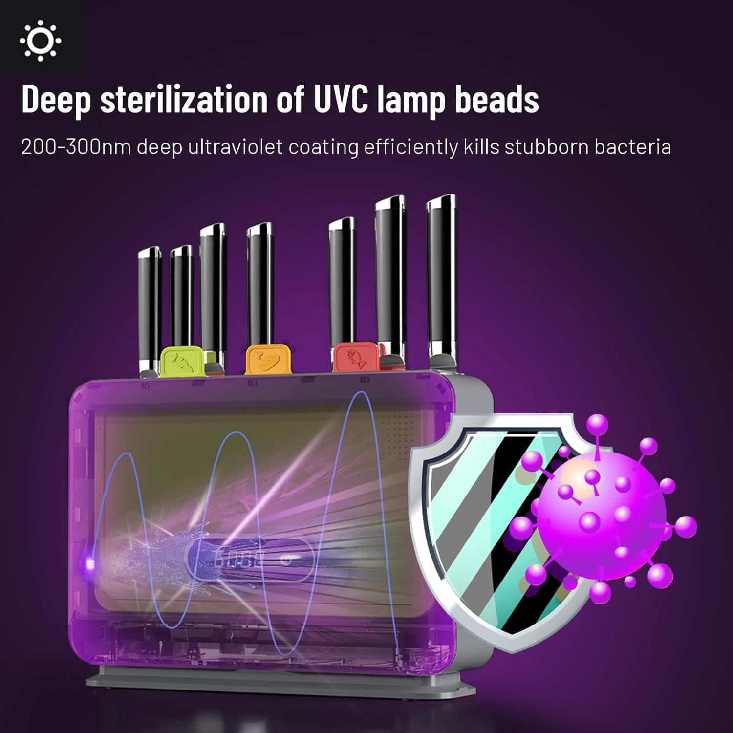 【Smart Cutting Board】Our smart clean cutting board and knife block can bring you a double deep clean cooking experience, protect your family's health, solve kitchen hygiene problems, touch the switch, it will be automatically turned off, one key purification.