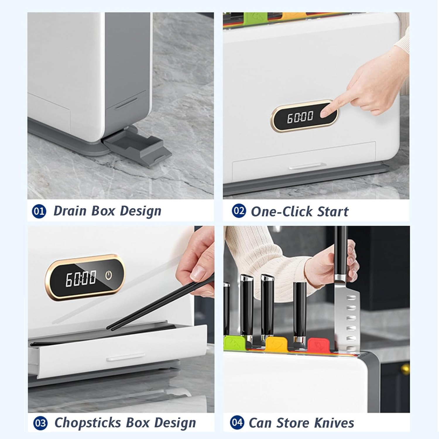 【Hot Air Drying】Put the cleaned cutting board and knives into the organizer, turn on the PTC heat cycle drying, constant temperature heating, effectively remove water stains, cleaning plus drying, double protection. It also extends the service life of knives and cutting boards!
