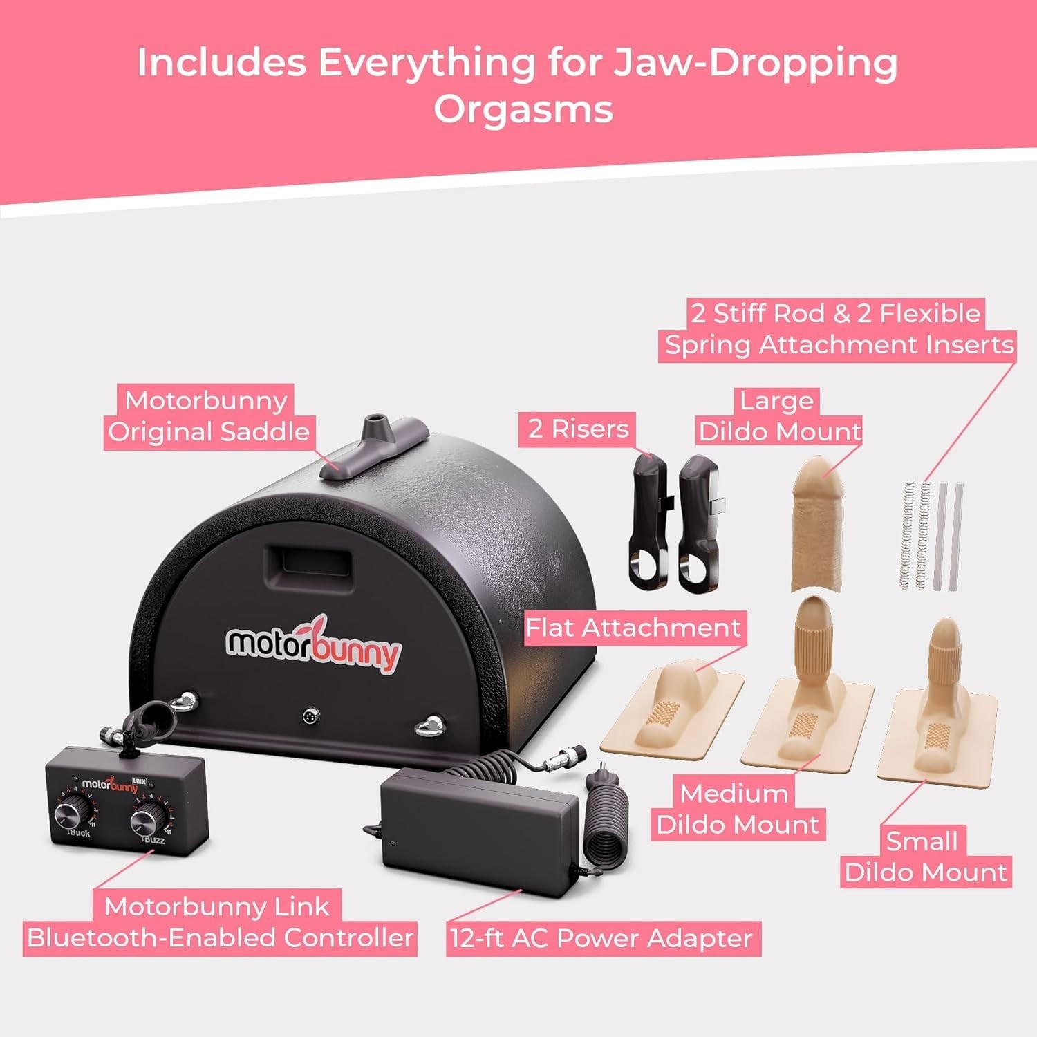 • Original Link Package Includes - (1) Motorbunny Original Saddle, (3) Dildo Mounts, (1) Flat Attachment, (2) Risers for Flat Attachment, (2) Stiff Rod Attachment Inserts, (2) Flexible Spring Attachment Inserts, (1) AC Power Adapter, (1) Motorbunny Link Bluetooth-Enabled Controller.