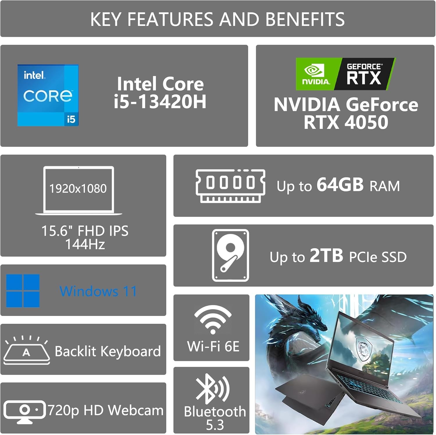 【MSI THIN Gaming Laptop i5】: Intel Core i5-13420H (8 Cores, 4P + 4E, 12 Threads, 12 MB Intel Smart Cache, 4.60 GHz Max Turbo Frequency)