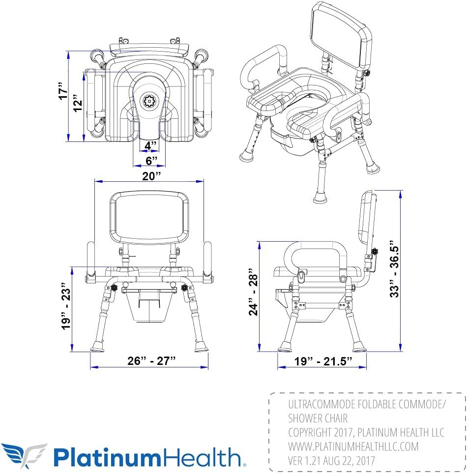 MODERN DESIGN- No more need for embarrassing, clunky, monotone commodes that look like they have been around since the 1950s. The UltraCommode shower chair for bathtub and shower features contemporary blue or gray padding options with modern brushed aluminum frame. CAN BE FOLDED IN SECONDS FOR EASY STORAGE AND TRAVEL. Please review dimensions carefully.