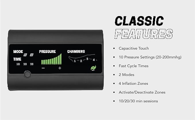 You're in control - With 10 customizable pressure settings, 2 compression modes, 3 session duration options, position indicators, and the ability to deactivate specific chambers, you can control how long you want to go.