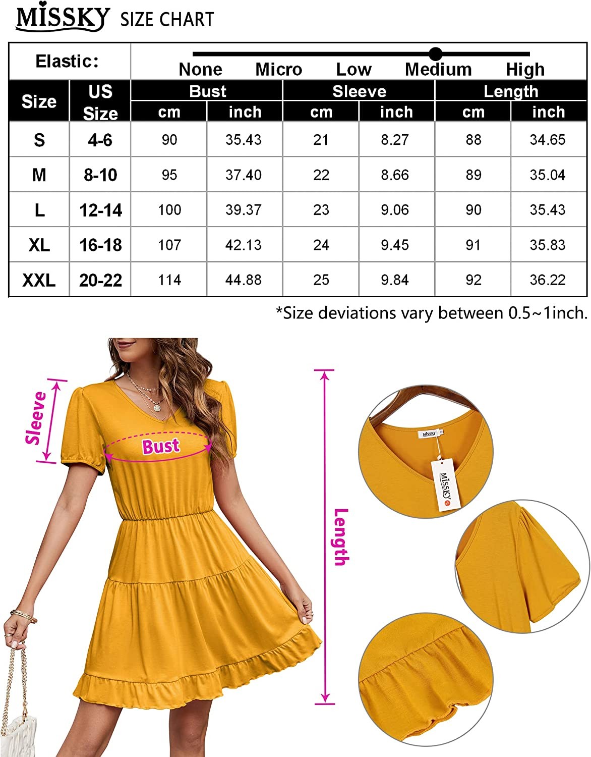 Ruffle Dress, Mini Dress Elastic Waist V Neck Puff Sleeve Casual Loose Flowy Swing Solid Tiered Short Dress..