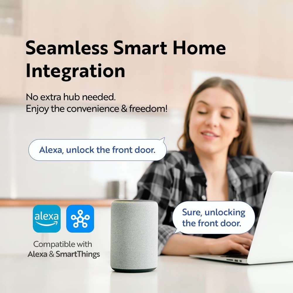 Seamless Smart Home Integration, No Hub Required: Experience the convenience of controlling your door lock with voice commands via Amazon Alexa and SmartThings. The GT10BK connects directly to your smart devices, eliminating the need for an additional hub. Our dedicated app also enables remote access, ensuring you're always in control of your home's security.