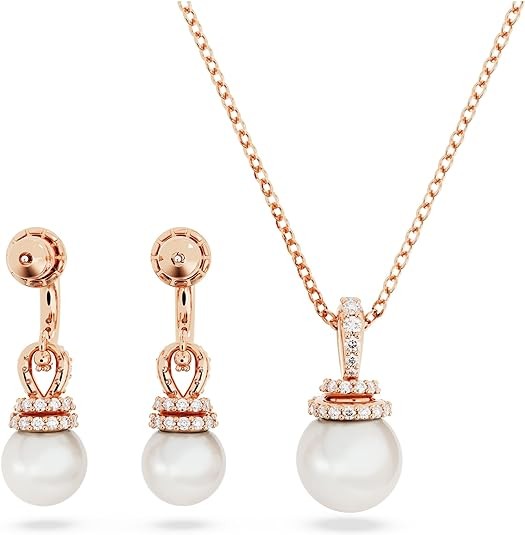 SIMPLE ELEGANCE: This rose gold-finish Y-shaped pendant necklace and pendant earring set features shimmering clear pavé crystals and luminous pearls for a timeless, sophisticated look.