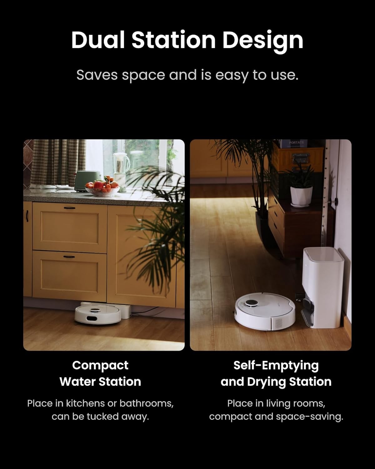 Unique Water Station: To make S10 robotic vacuum 100% automated, we created a Auto-Refill and Drain Water Station designed to be compact and can be used without the need for cables, making it easy to place in places with plumbing systems such as kitchens or laundry rooms. We provide a variety of retrofit accessories to easily adapt to existing water pipes or faucets, and installation only takes a few minutes.