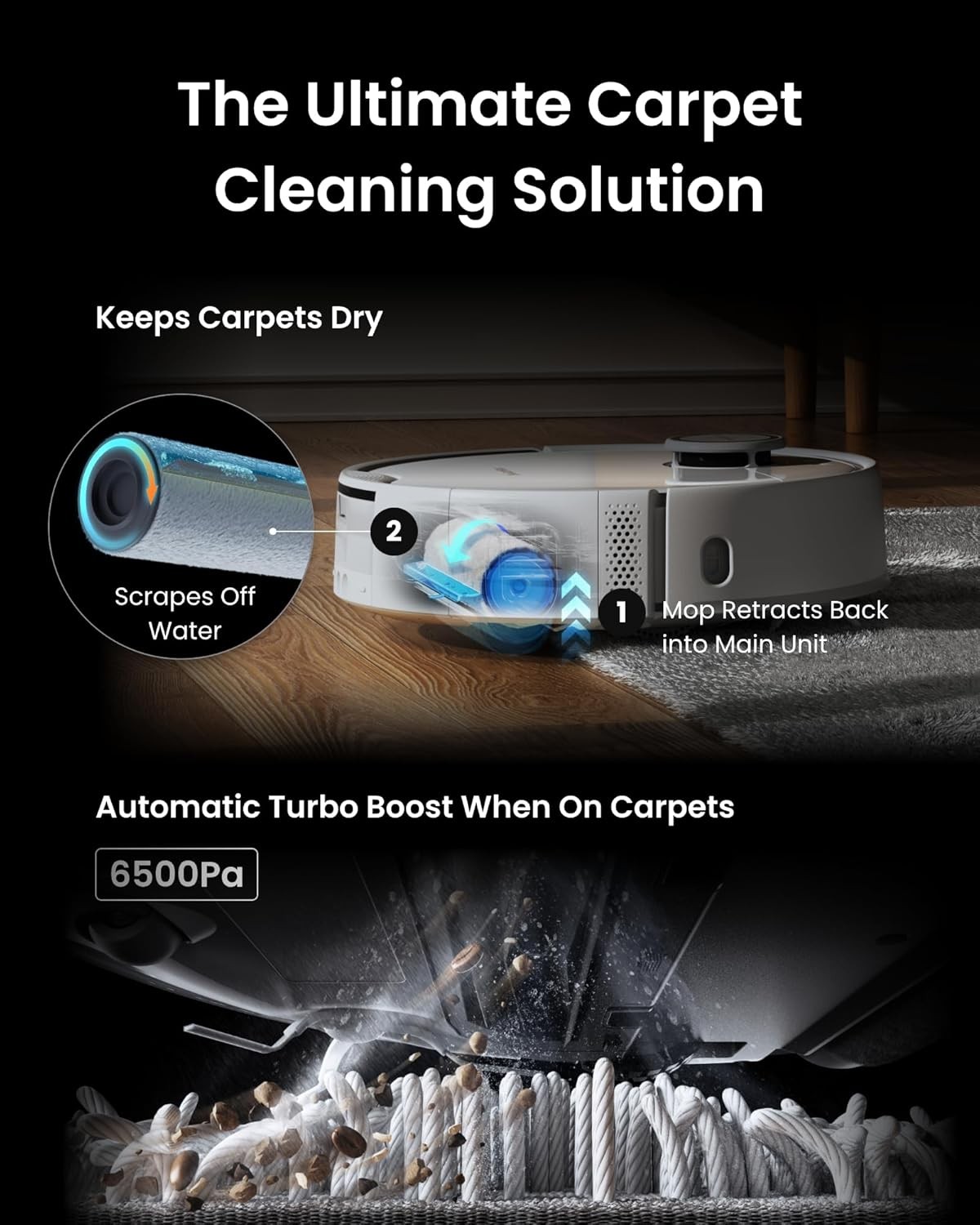 6500Pa Powerful Suction Power: Suitable for removing hair and is an ideal choice for pet families. Multiple cleaning modes can adapt to full coverage of your home. When encountering carpets, S10 robot mop can also automatically lift its roller mop up and enhance suction power, ensuring that no blind spots are missed.