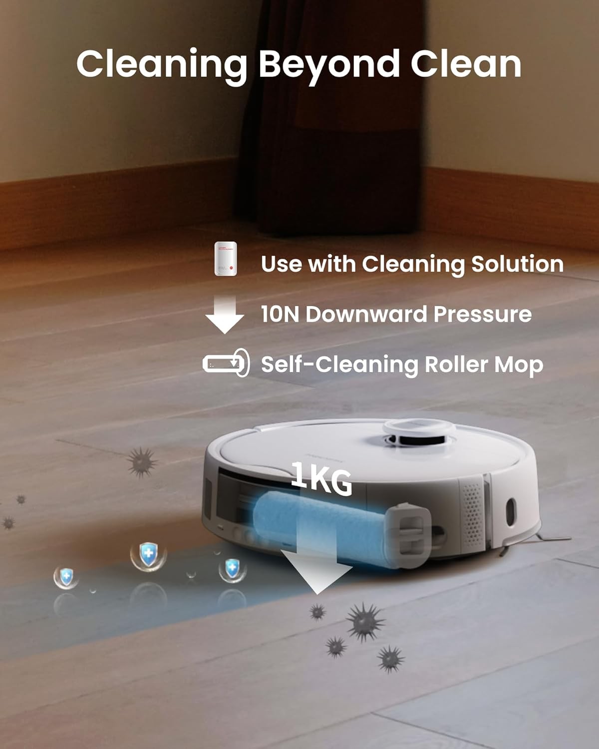 Self-Mop-Washing On the Go: The robot vacuum cleaner cleans your home and self-washes its mop at the same time thanks to our RevoRoll Roller Mop design and RinseSync. Our roller mop uses 10N worth of pressure to efficiently remove stubborn dirt and can avoid damaging flooring too. RinseSync enables its Roller Mop to self-washing in real time, making sure it doesn't spread dirt around the home.