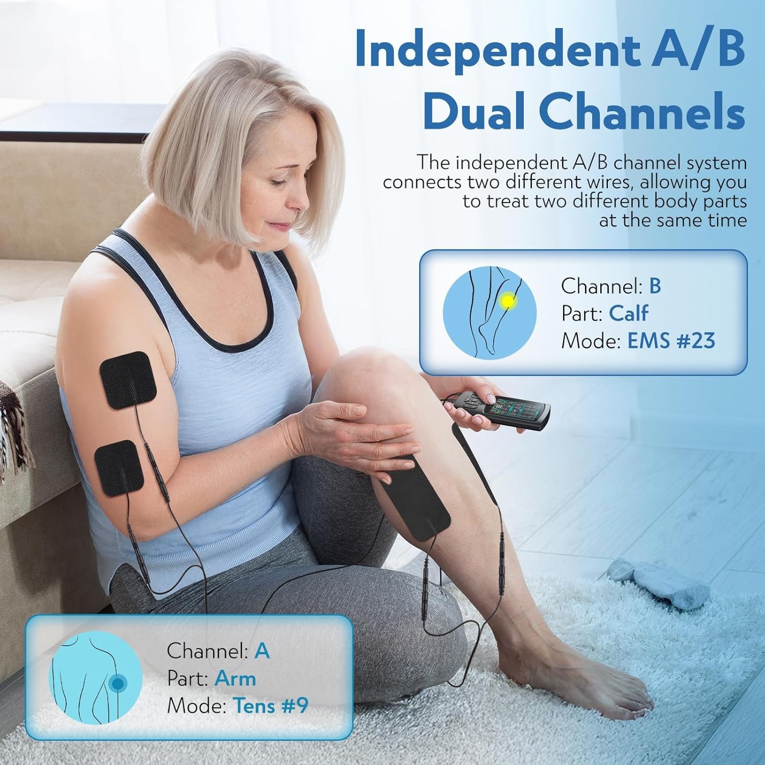 • 【Independent A/B Dual Channel & Targeting Different Parts Pain Relief】For example, when the A channel is set to Intensity 3, TENS Mode 9 for arm massage, the B channel can also be used for shoulder massage at the same time, set to Intensity 5, MASSAGE Mode 25. The two channels can work together to target the whole body parts such as the arms, lower back, back, shoulders, thighs, calves and other parts of the body to achieve a deep level of relaxation.
