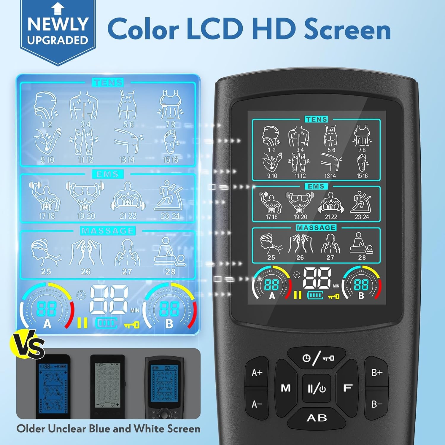 TENS Unit EMS Muscle Stimulator with 28 Modes, Dual Channel Muscle Stimulator Machine with 8PCS Electrode Pads, TENS Machine for Muscles, Shoulder, Neck, Back, New Upgraded Color Screen