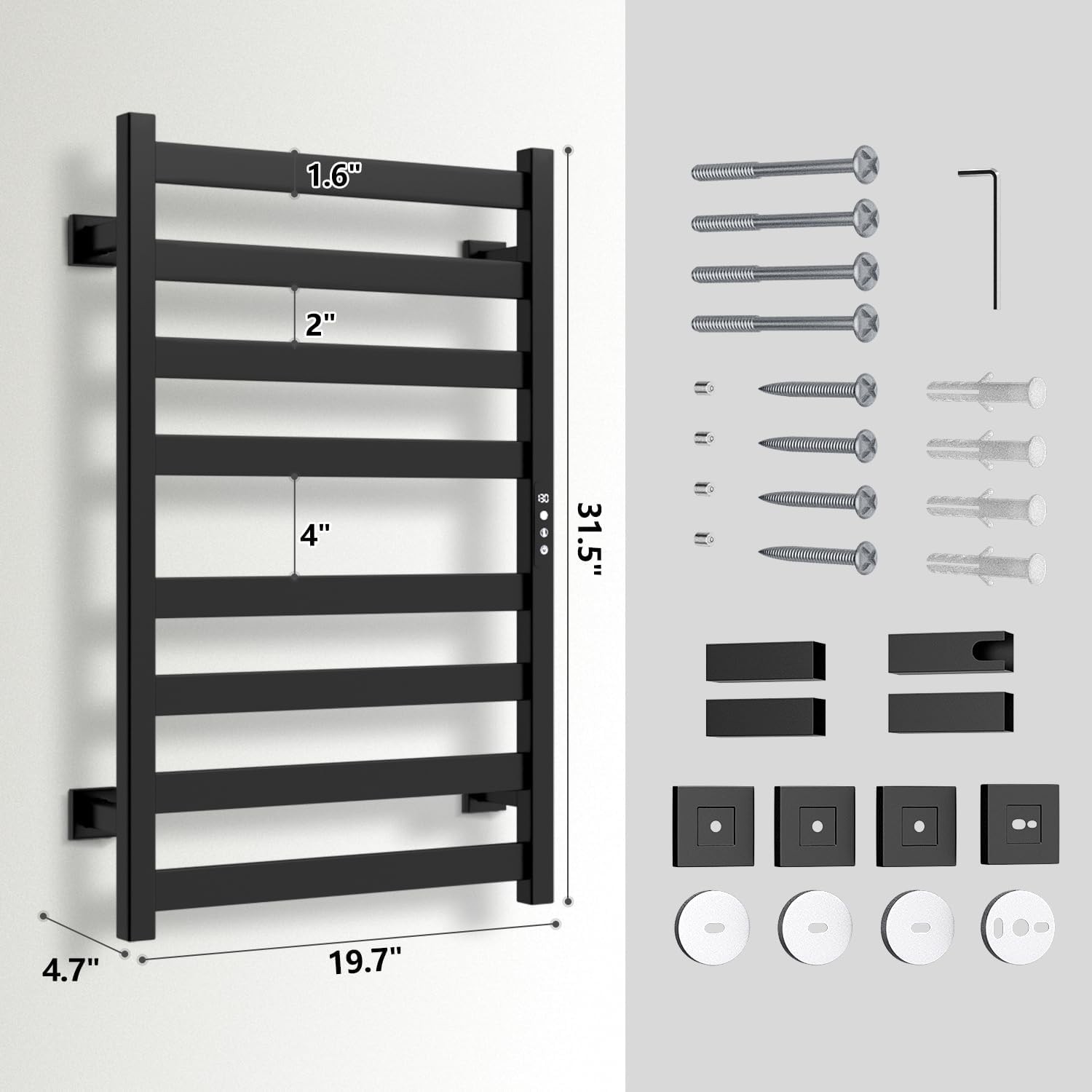 【Function Upgrade】The heated towel rack is made of 201 stainless steel, and has an electrostatic black coating on the surface, which has excellent rust and corrosion resistance, high-quality waterproof electric heating elements, and the waterproof level reaches IPX5. Built-in visual timer and temperature control switch. The time can be set from 1 hour to 9 hours or always on (0H).