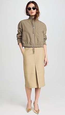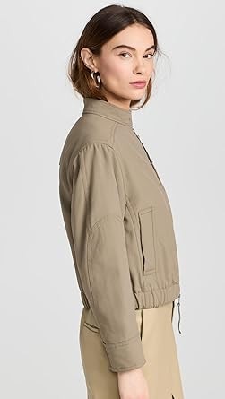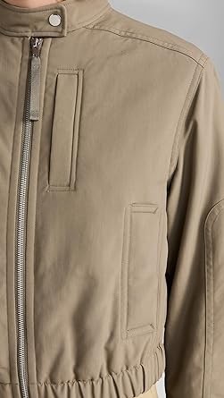 Two-way zip at front. Snap-button collar and adjustable cuffs. Chest welt and side pockets. Locking ring on the back.