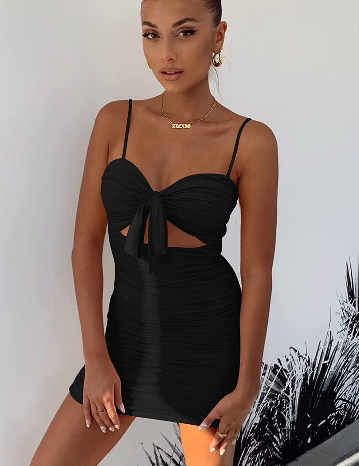 Women's Sexy Bodycon Cut Out Ruched Backless Spaghetti Strap Mini Club Party Dresses-