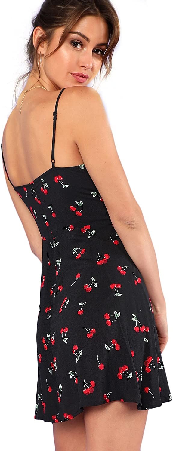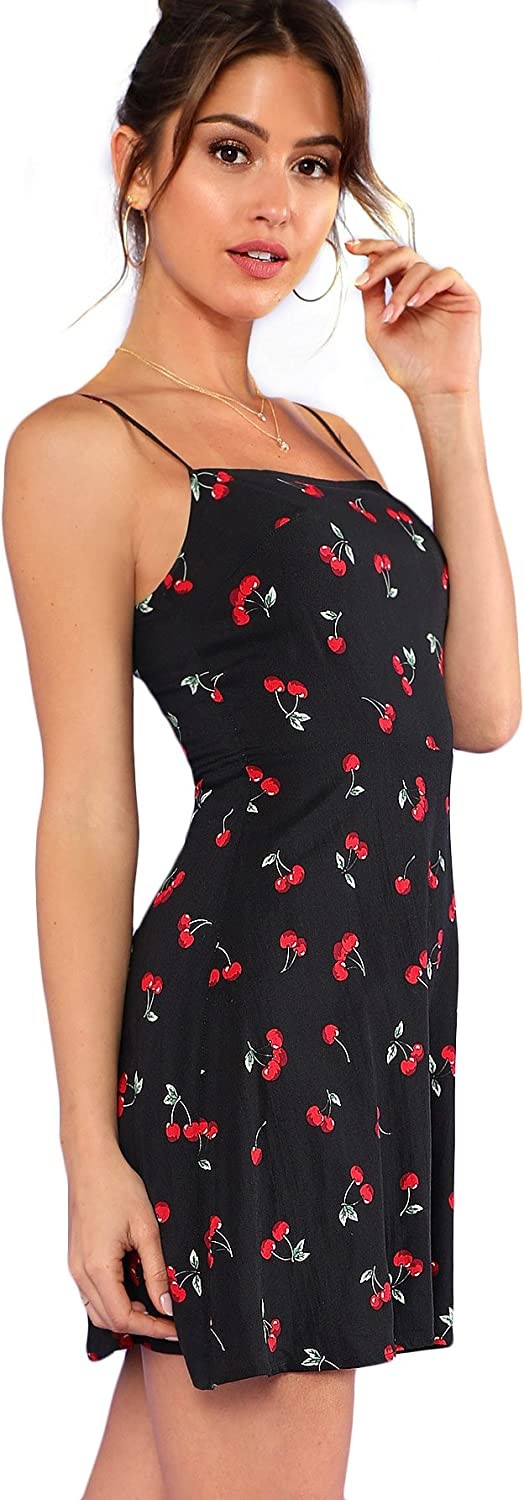 Women's Summer Floral Cherry Print A Line Short Cami Dress-
